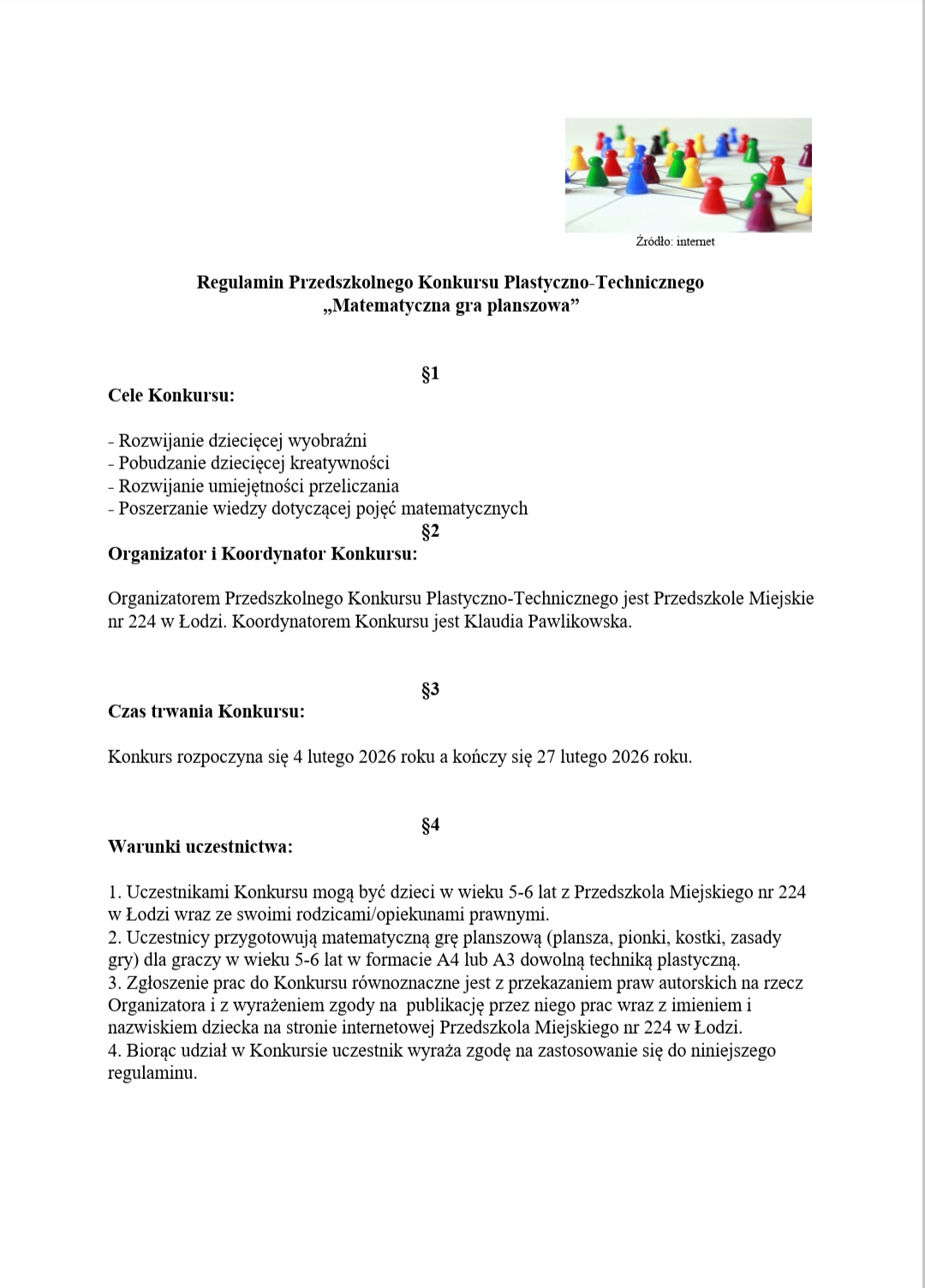 Serdecznie zapraszamy i zachęcamy Dzieci i Rodziców do udziału w kolejnym Konkursie Plastyczno-Technicznym, tym razem pt. "Matematyczna gra planszowa" organizowanym przez nasze Przedszkole. Szczegółowe informacje znajdują się na załączonych zdjęciach Regulaminu. Życzymy powodzenia!