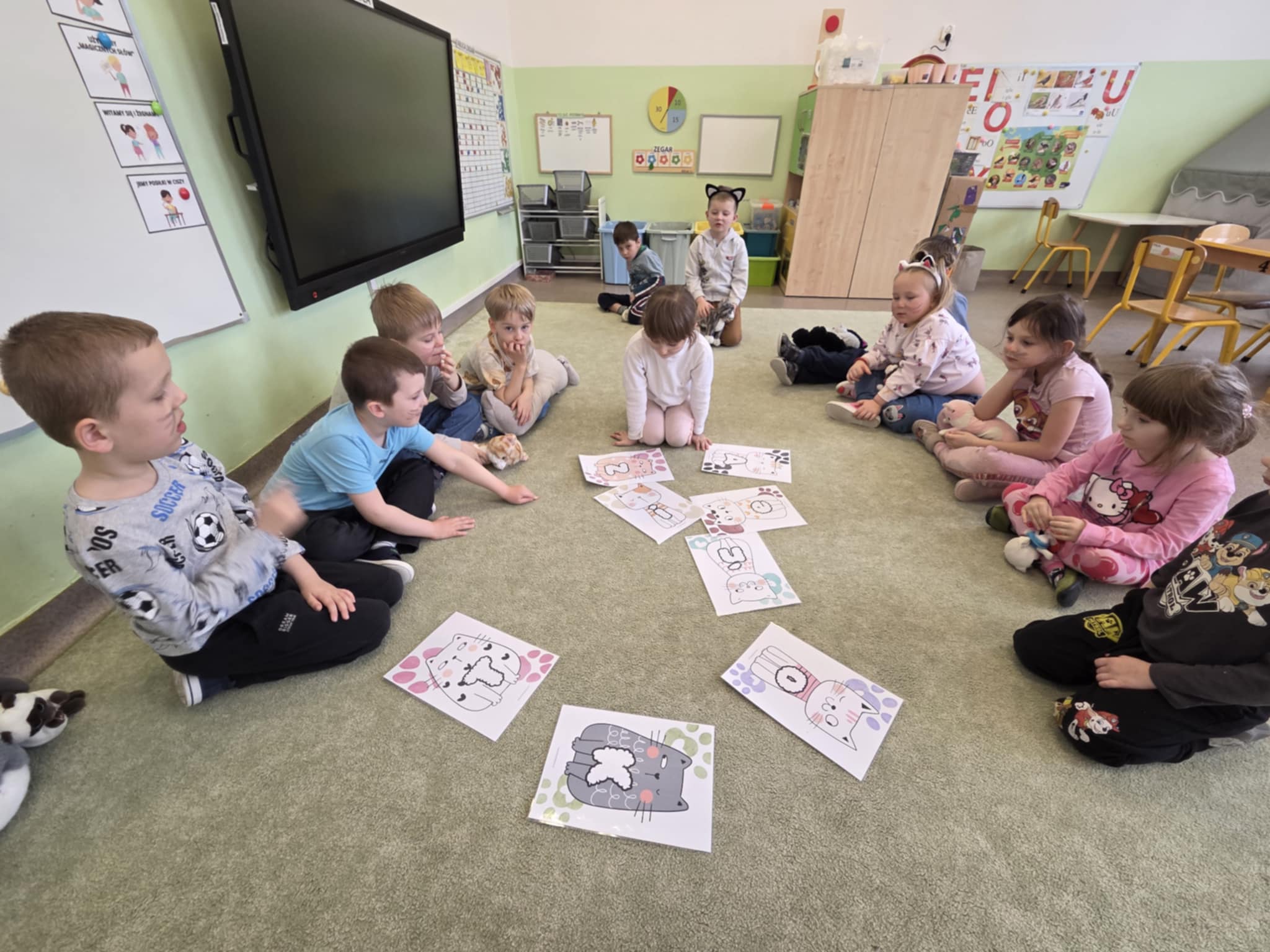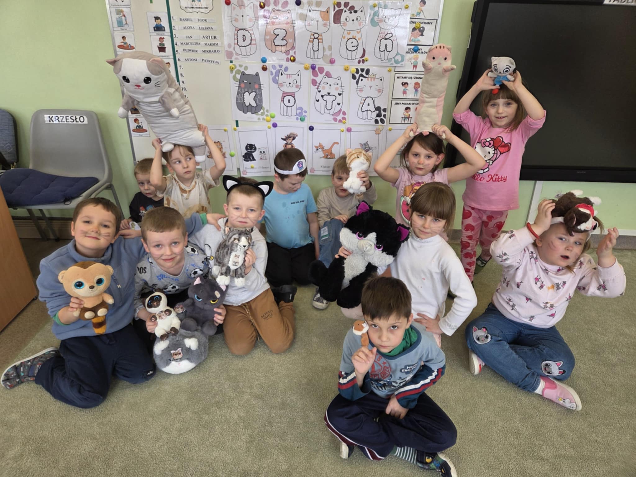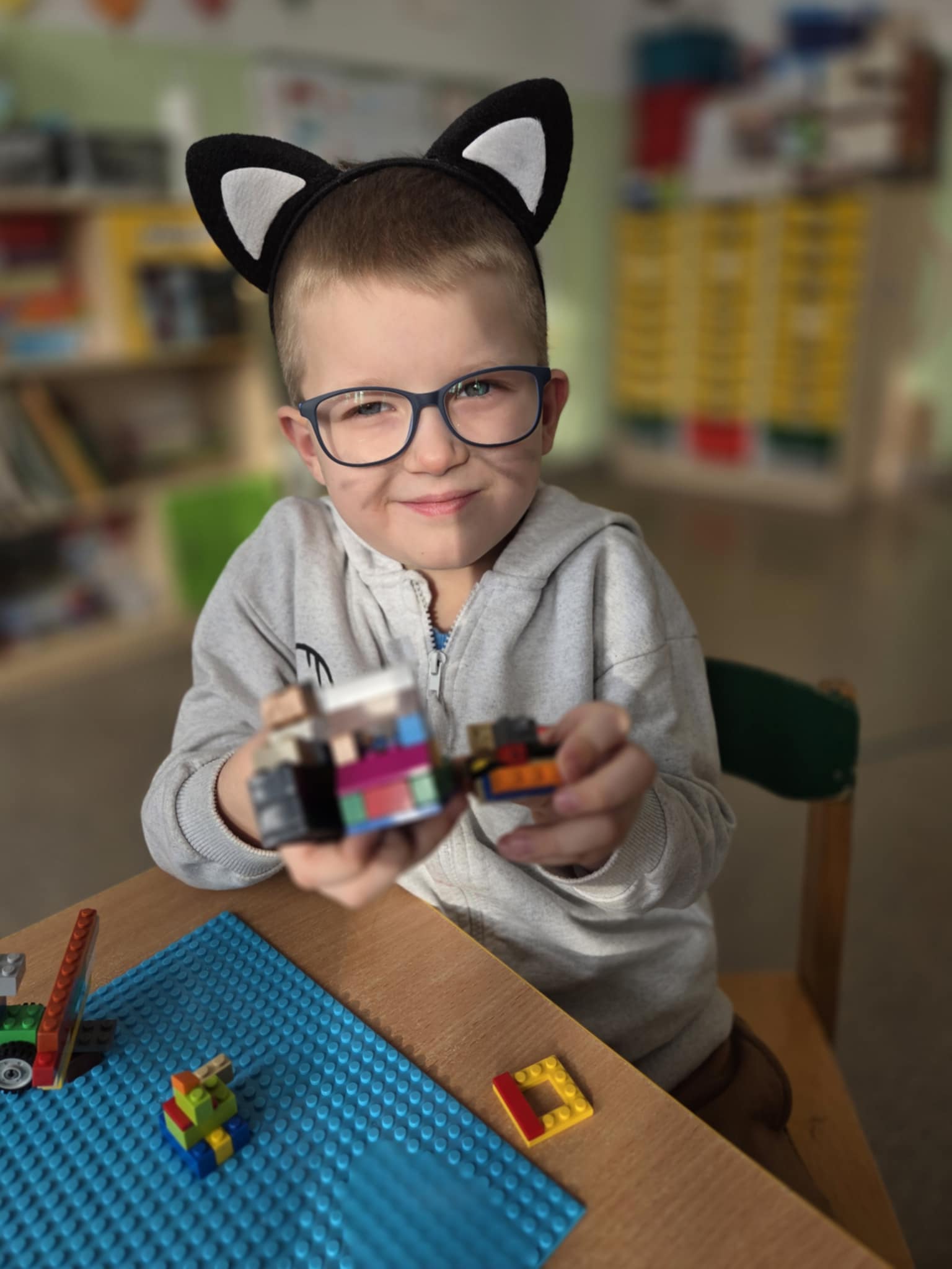 Dzisiejszego popołudnia dzieci z grupy Stokrotki z ogromną radością świętowały Światowy Dzień Kota. Spotkanie rozpoczęliśmy od wesołego powitania – wszyscy przywitali się naśladując kocie zwyczaje. Następnie dzieci obejrzały interesujący film edukacyjny, dzięki któremu poznały wygląd, różne rasy oraz zwyczaje tych niezwykłych zwierząt. Każde chętne dziecko miało okazję zaprezentować swojego pluszowego kotka i opowiedzieć o nim kolegom oraz koleżankom. Nie zabrakło również piosenek i wierszy o kotach, które wprowadziły wszystkich w radosny nastrój. Na zakończenie świętowania dzieci wykonały prace plastyczne inspirowane kocim tematem. Antek i Janek z dużym zaangażowaniem tworzyli koty z klocków LEGO. Kociej zabawie i uśmiechom nie było końca!