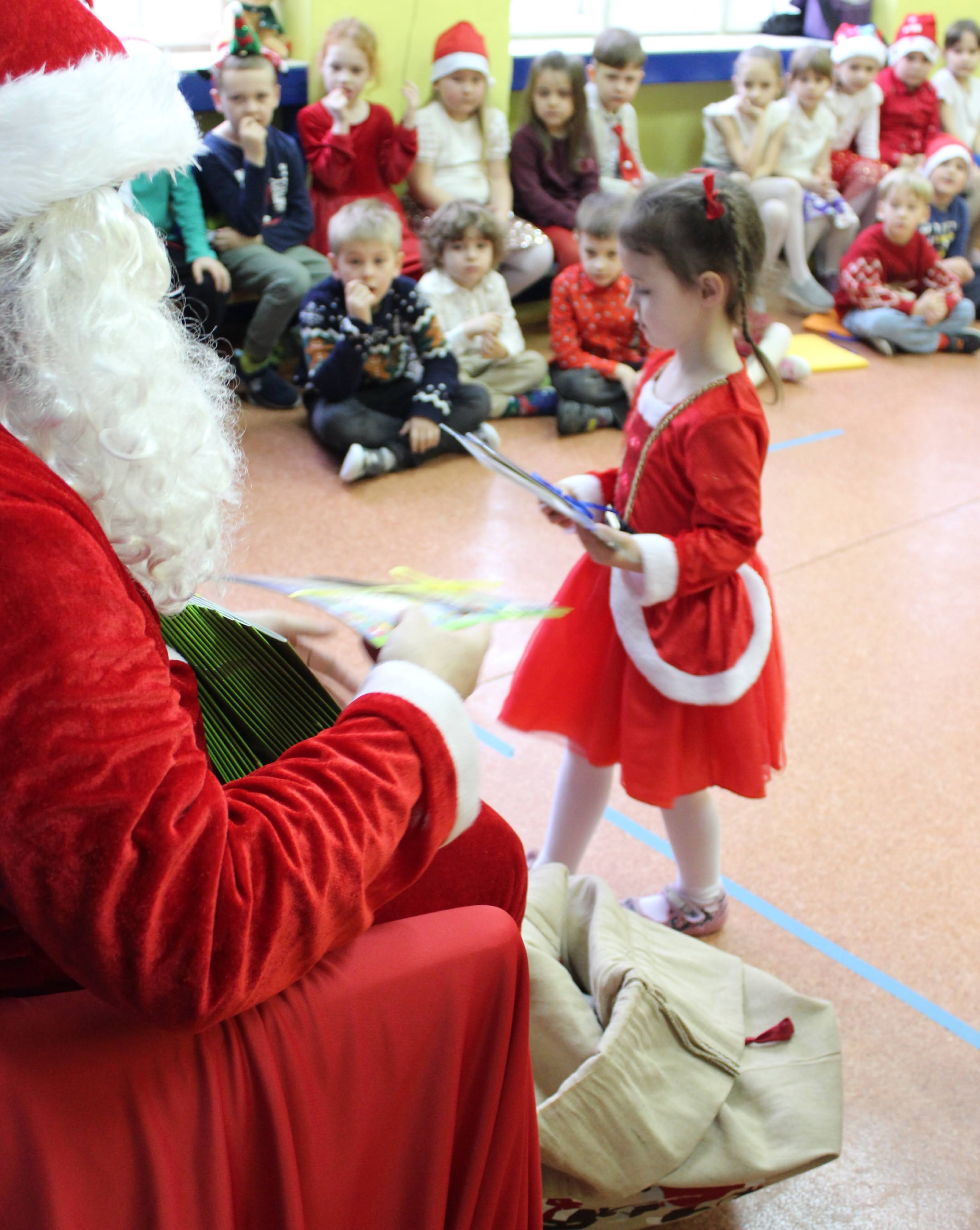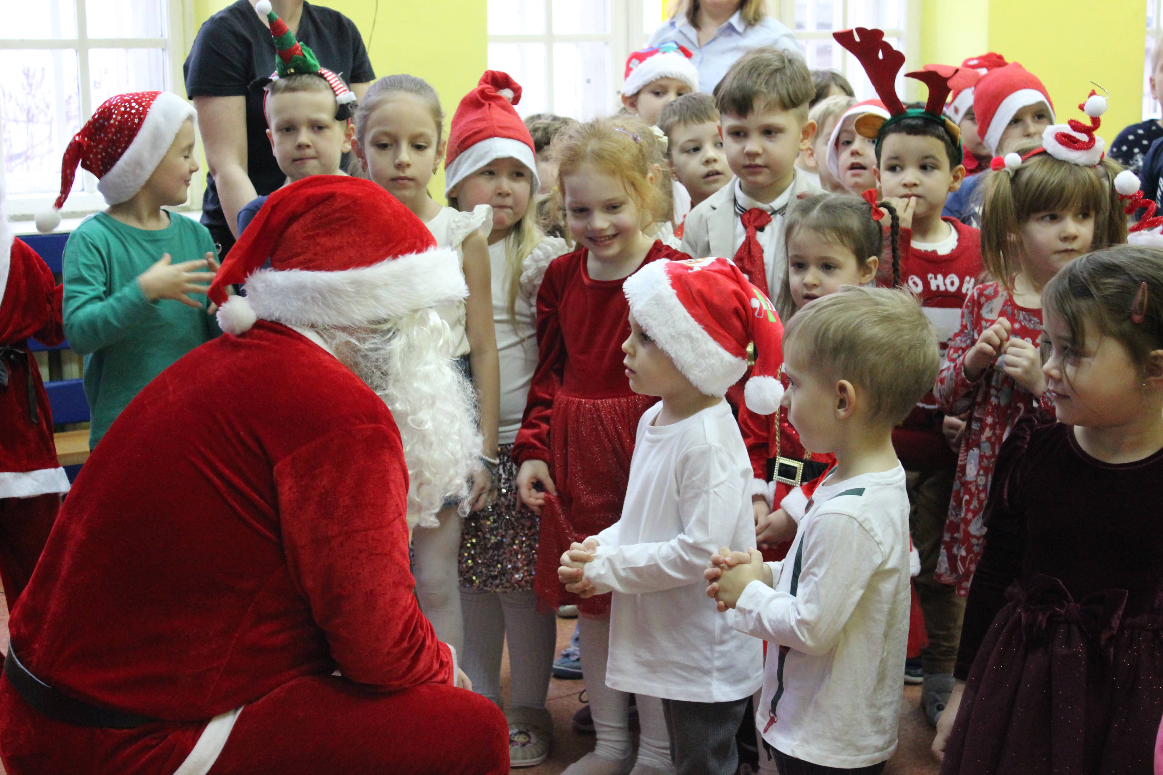 Po części artystycznej nadszedł najbardziej wyczekiwany moment – rozdawanie prezentów. Mikołaj obdarował każde dziecko upominkiem, a na twarzach przedszkolaków pojawiły się szerokie uśmiechy.