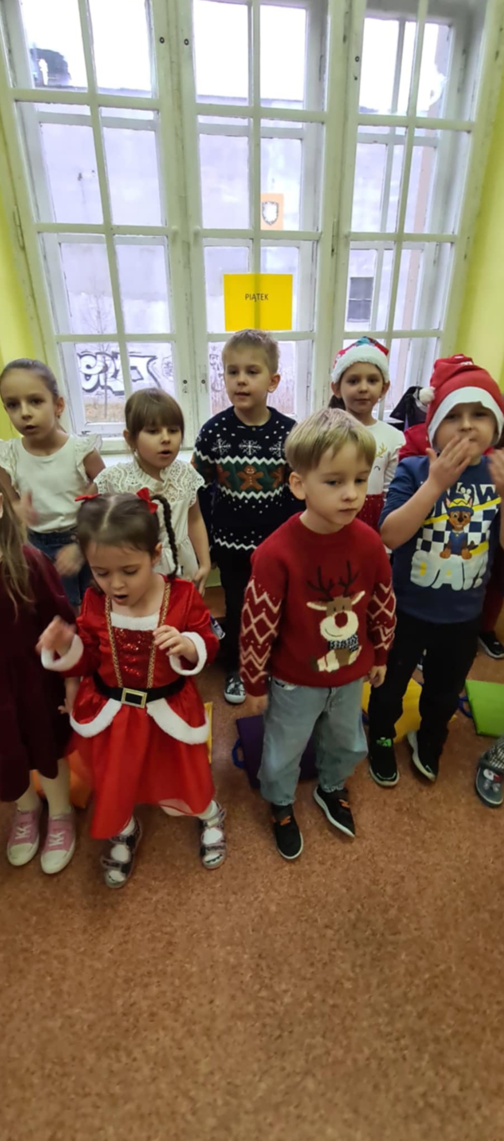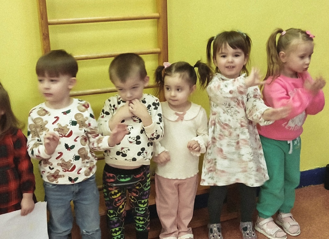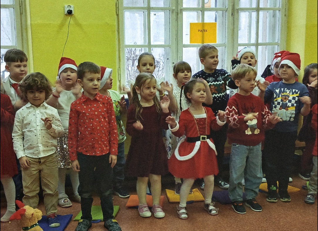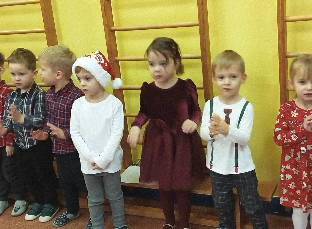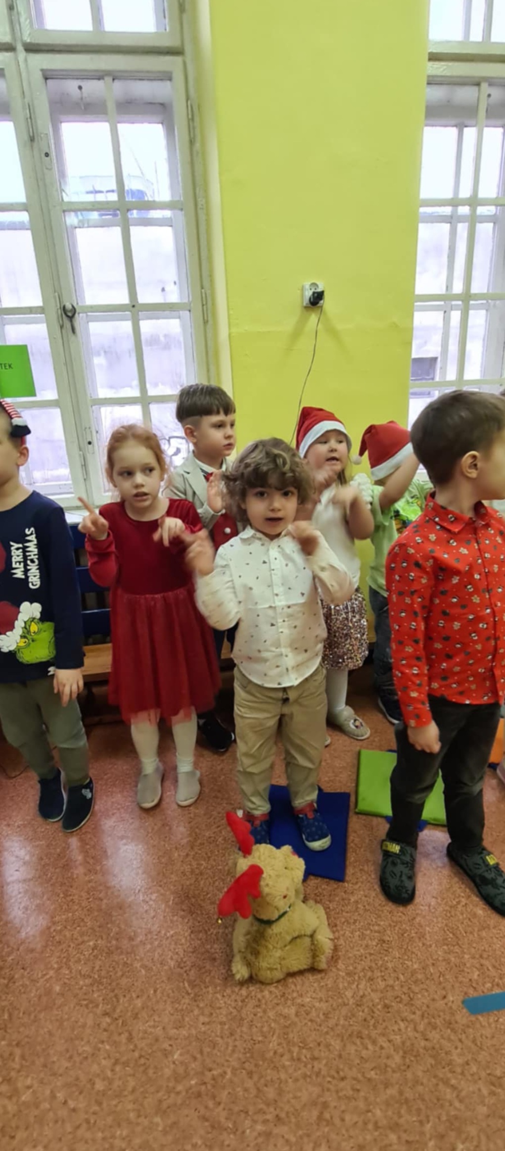 Już od samego rana w salach panowała radosna atmosfera, a dzieci z niecierpliwością wypatrywały momentu jego przybycia. Gdy tylko Mikołaj przekroczył próg przedszkola, wszystkie dzieci powitały go wspólną, radosną piosenką. Był wyraźnie wzruszony tak ciepłym przyjęciem! Następnie każda z grup zaprezentowała własną piosenkę przygotowaną specjalnie na tę okazję. Przedszkolaki śpiewały z ogromnym zaangażowaniem, a Mikołaj z uśmiechem słuchał i dziękował za piękne występy.