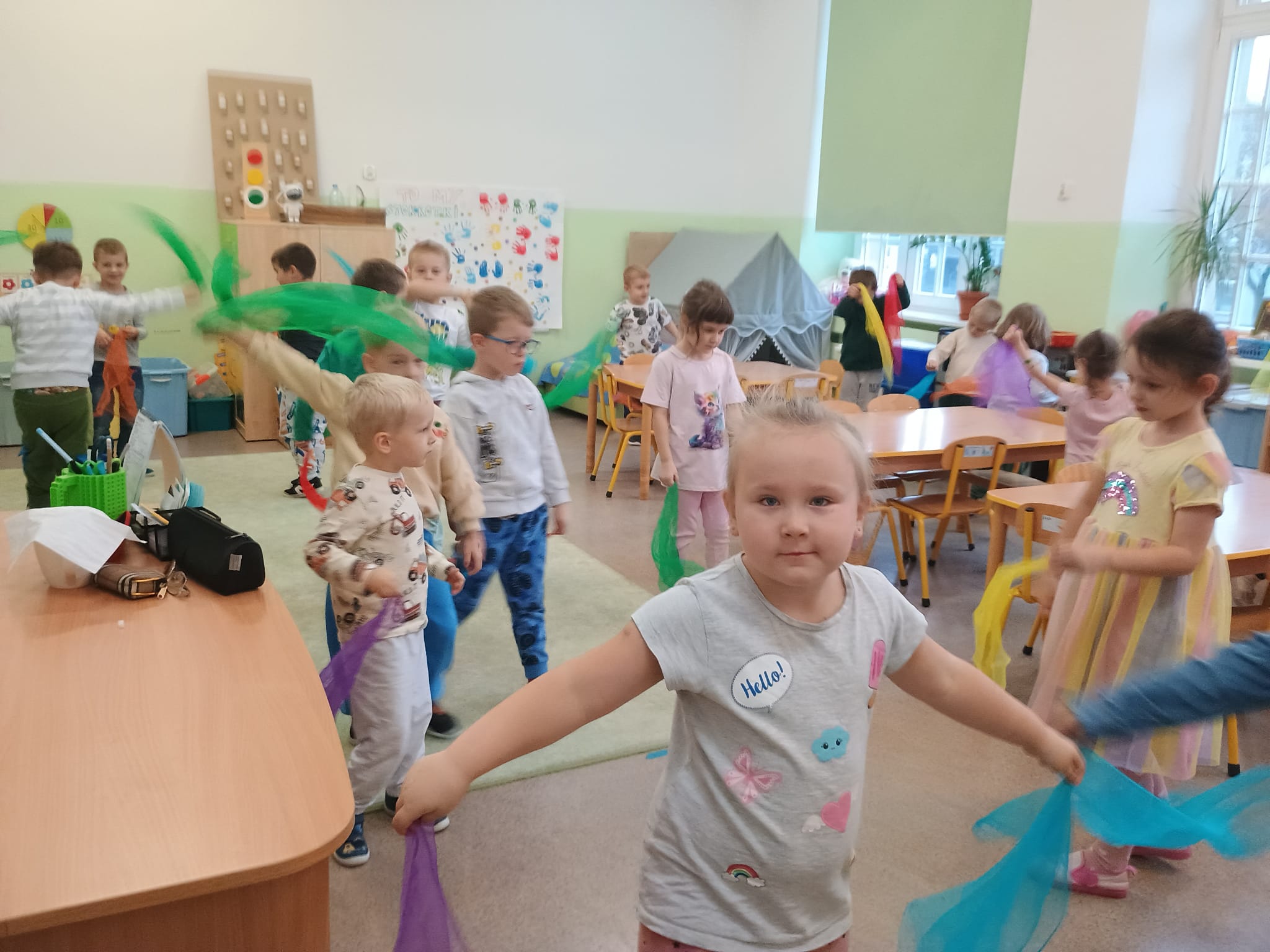 "Motylem jestem, na, na, na, na, motylem jestem. Dzień minął już, a pragnę jeszcze, siąść tu i tam... Motylem jestem... Pamiętacie tę piosenkę pani Ireny Jarockiej? Fajnie trochę pobyć motylem. Potańczycie z nami? I razem: "Jak motyle, jak motyle, wzlećmy jeszcze choć na chwilę, w górę, aż pod niebo, tam, gdzie czeka nas słońca blask!"
