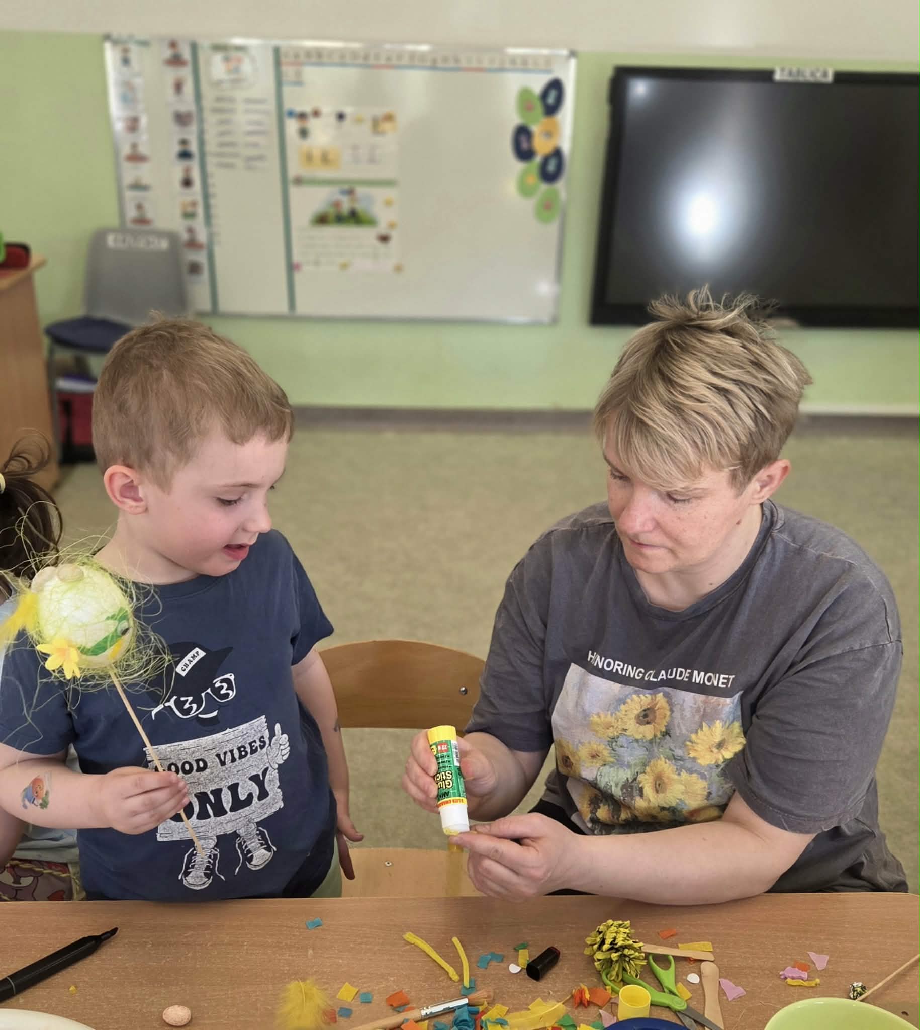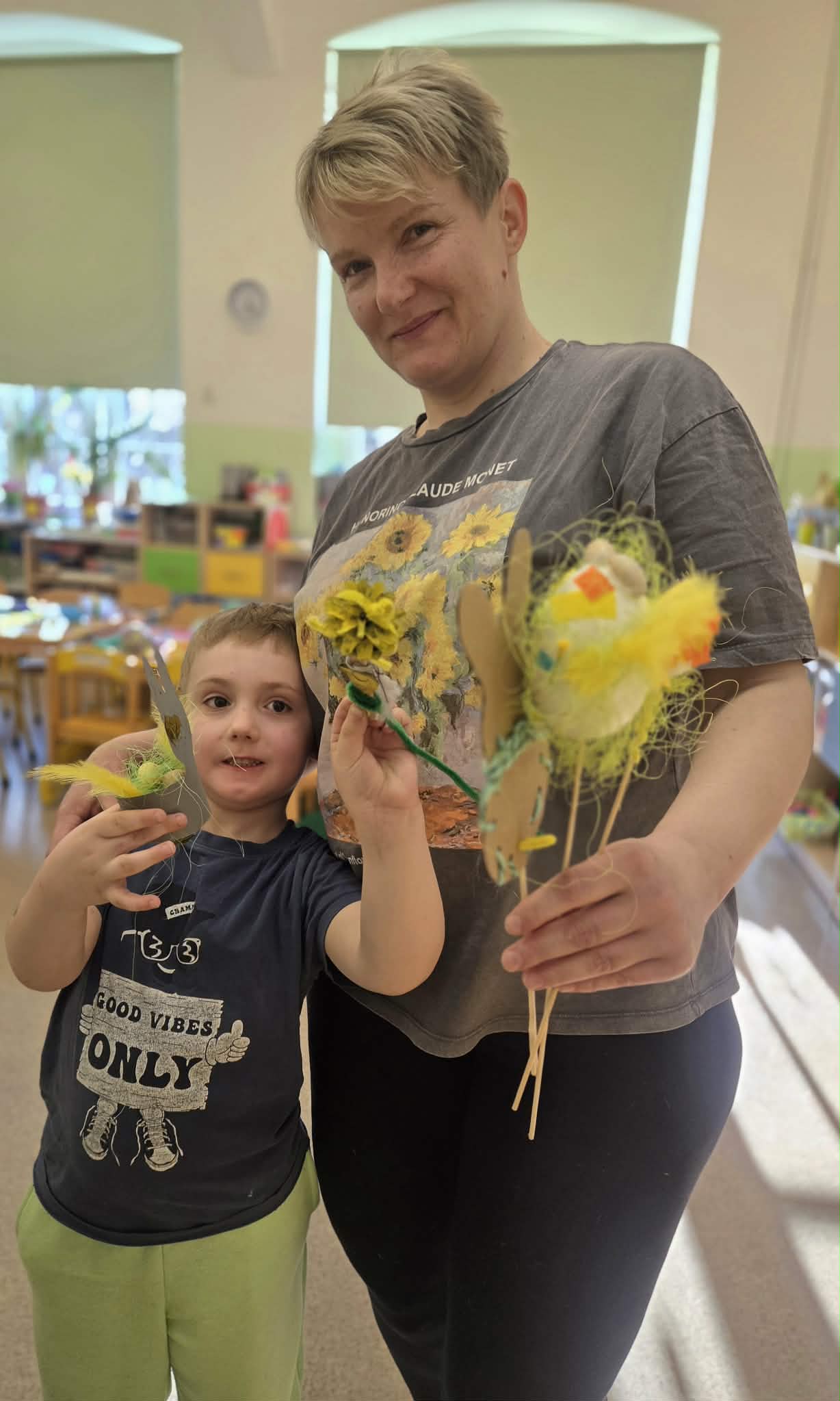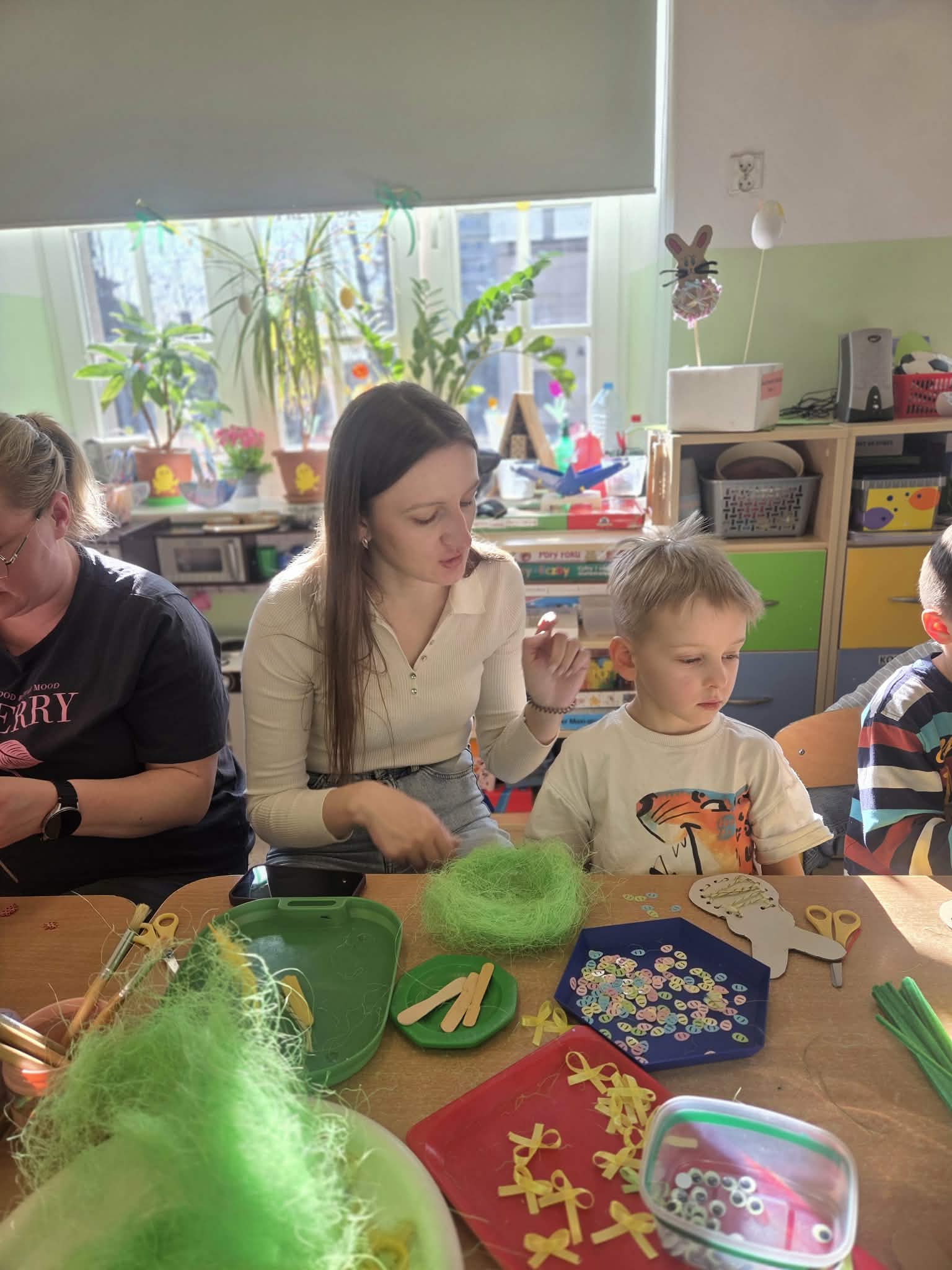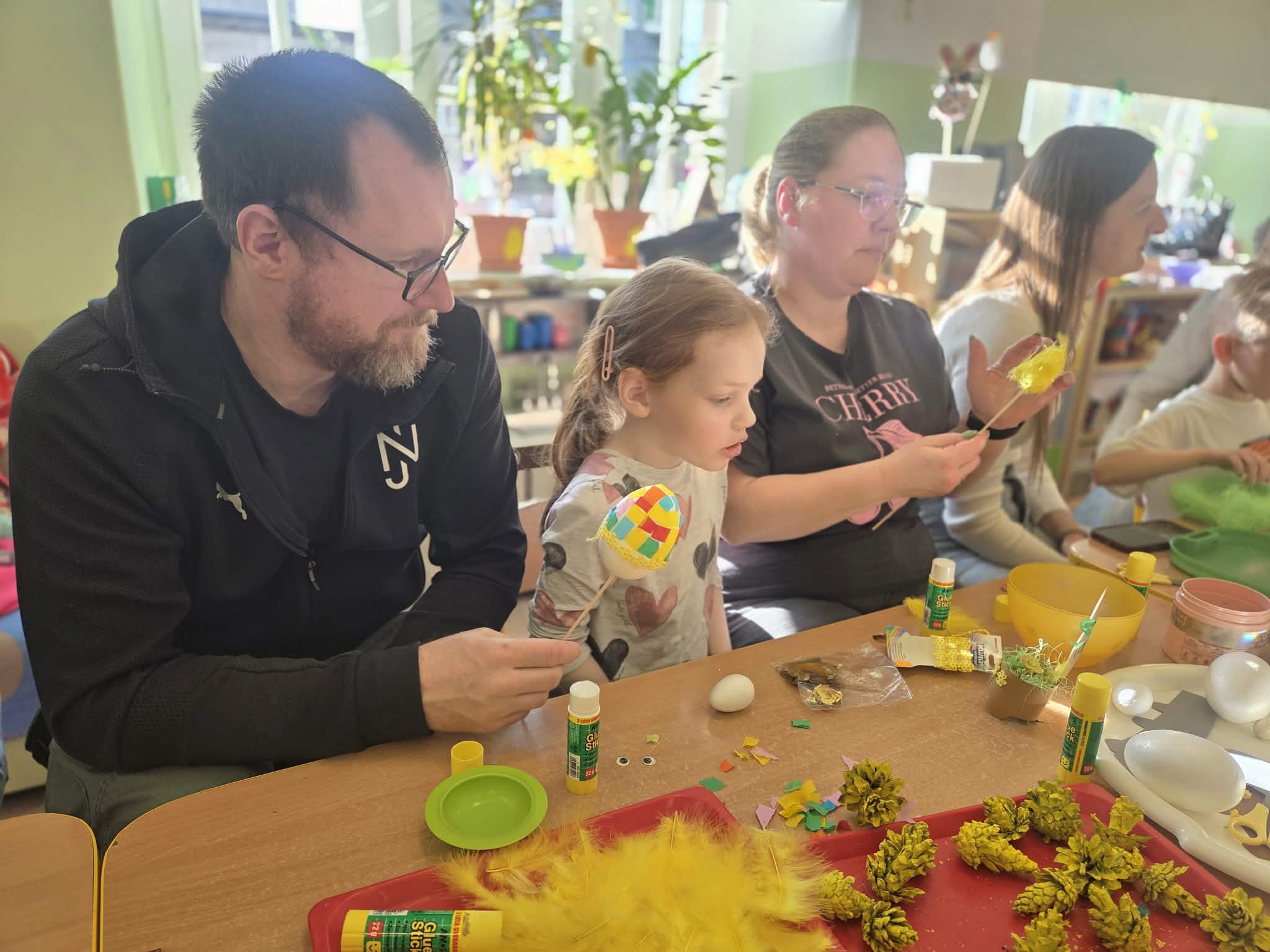 W grupie Stokrotek zapanowała prawdziwie świąteczna, rodzinna atmosfera. Podczas warsztatów wielkanocnych dzieci wspólnie z rodzicami spędziły wyjątkowe chwile pełne radości, uśmiechu i bliskości. Spotkanie rozpoczęło się od wesołych zabaw i zagadek w kole, które wprowadziły wszystkich w magiczny, wielkanocny nastrój. Następnie mali artyści wraz z rodzicami z ogromnym zaangażowaniem tworzyli świąteczne ozdoby – powstały urocze stroiki z kurczaczkiem, zajączki w sweterkach oraz kolorowe jajka. Był to piękny czas wspólnego tworzenia, rozmów i budowania relacji, który pokazał, jak ważne są takie chwile spędzone razem.
