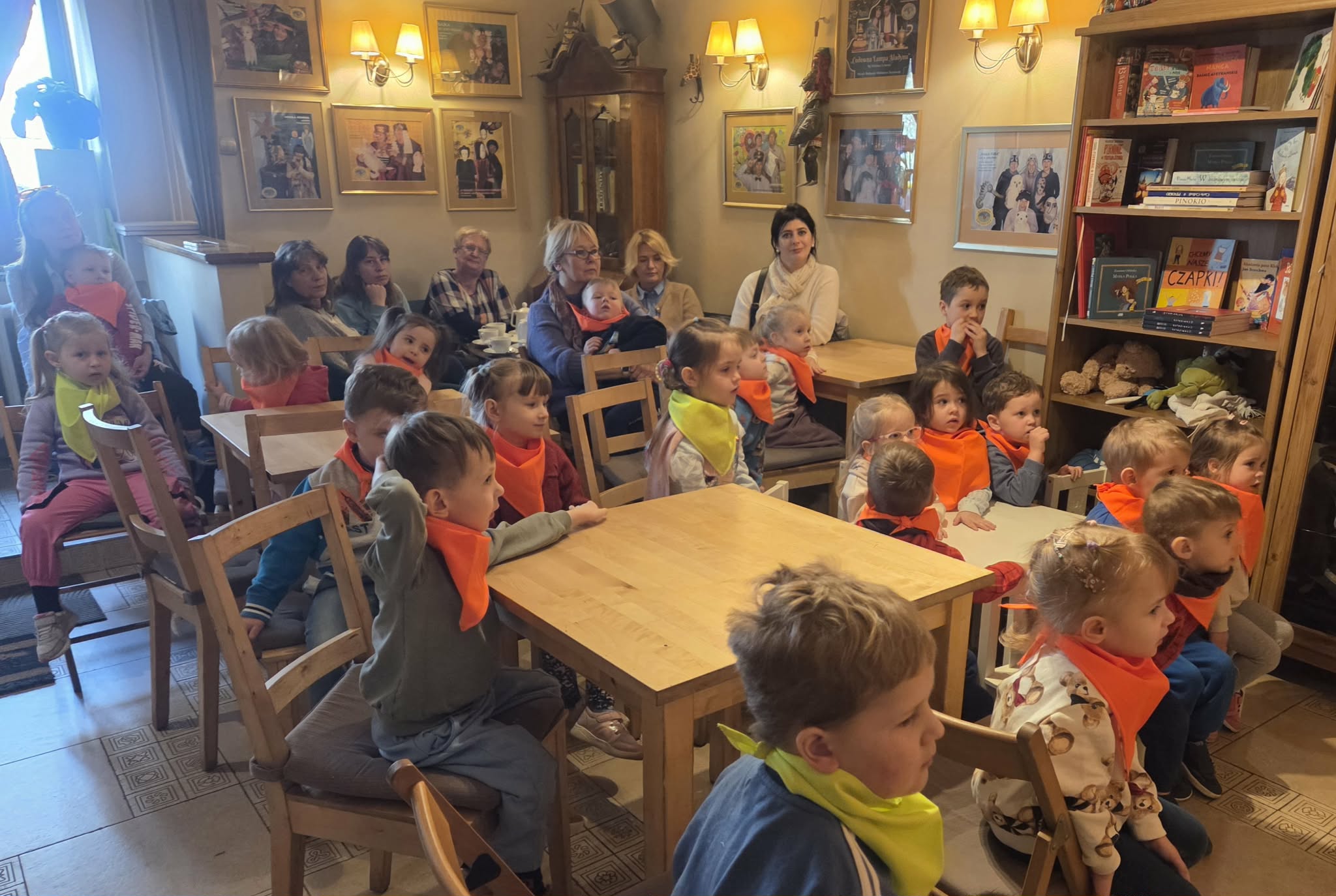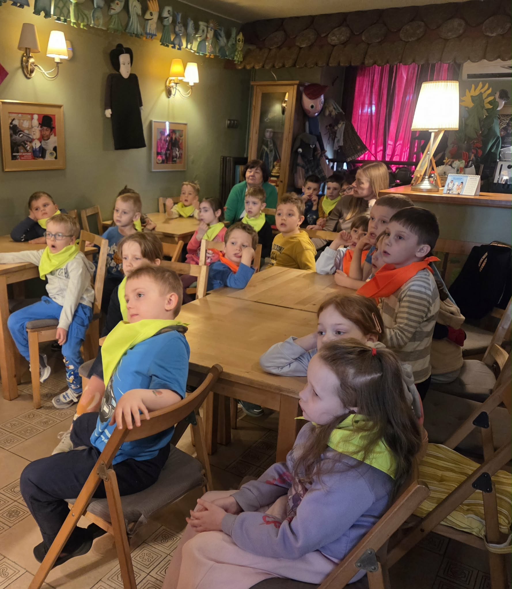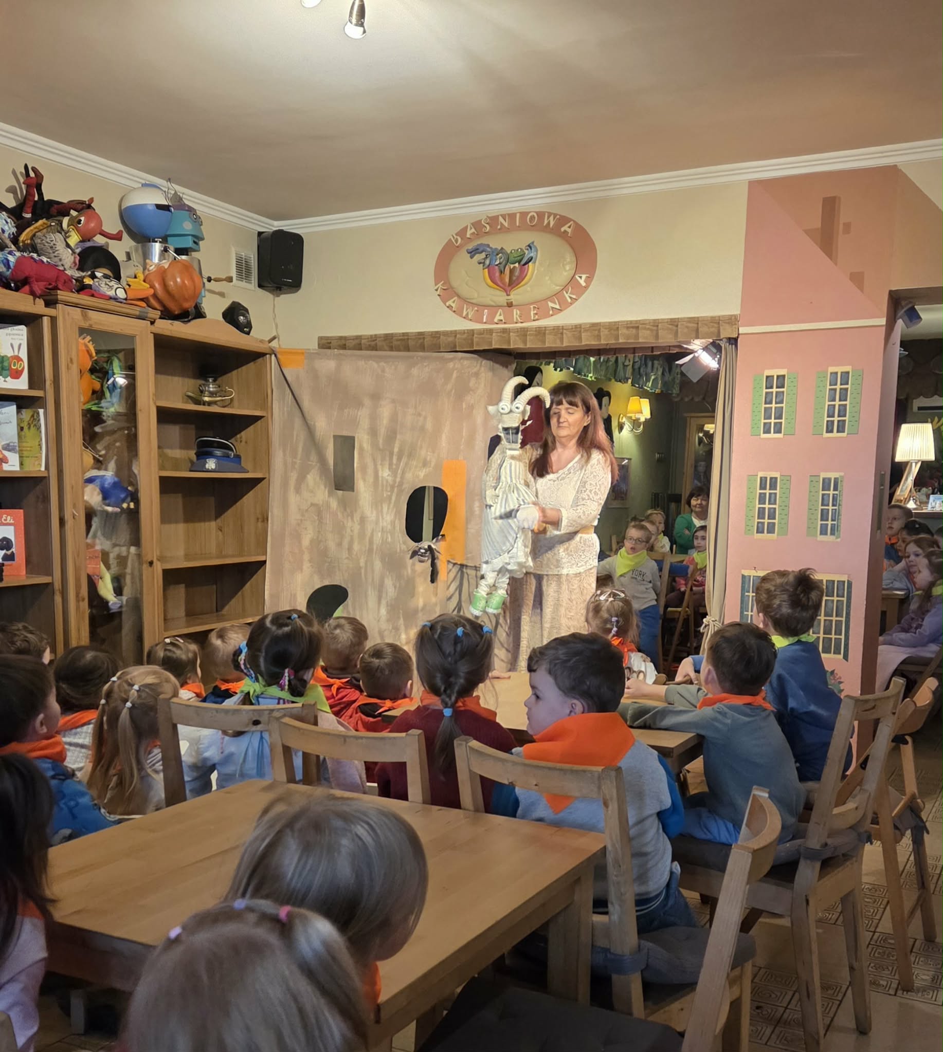 Dzieci z grup Biedronek, Myszek i Stokrotek wybrały się na wyjątkowe wyjście do Baśniowej Kawiarenki, gdzie obejrzały spektakl pt. „Siedem koźlątek”. Przedstawienie w ciekawy i przystępny sposób przypomniało znaną baśń, niosąc ze sobą ważne przesłanie o ostrożności i nieufności wobec nieznajomych. Dzieci z dużym zainteresowaniem śledziły losy bohaterów, reagując żywiołowo na zabawne sceny i angażując się w wydarzenia na scenie. Spektakl zachwycił nie tylko fabułą, ale także ciekawą scenografią oraz wykorzystaniem lalek, które wzbudziły ogromne zainteresowanie najmłodszych. Wyjście dostarczyło dzieciom wielu radości i niezapomnianych wrażeń, a także było doskonałą okazją do kontaktu ze sztuką teatralną.