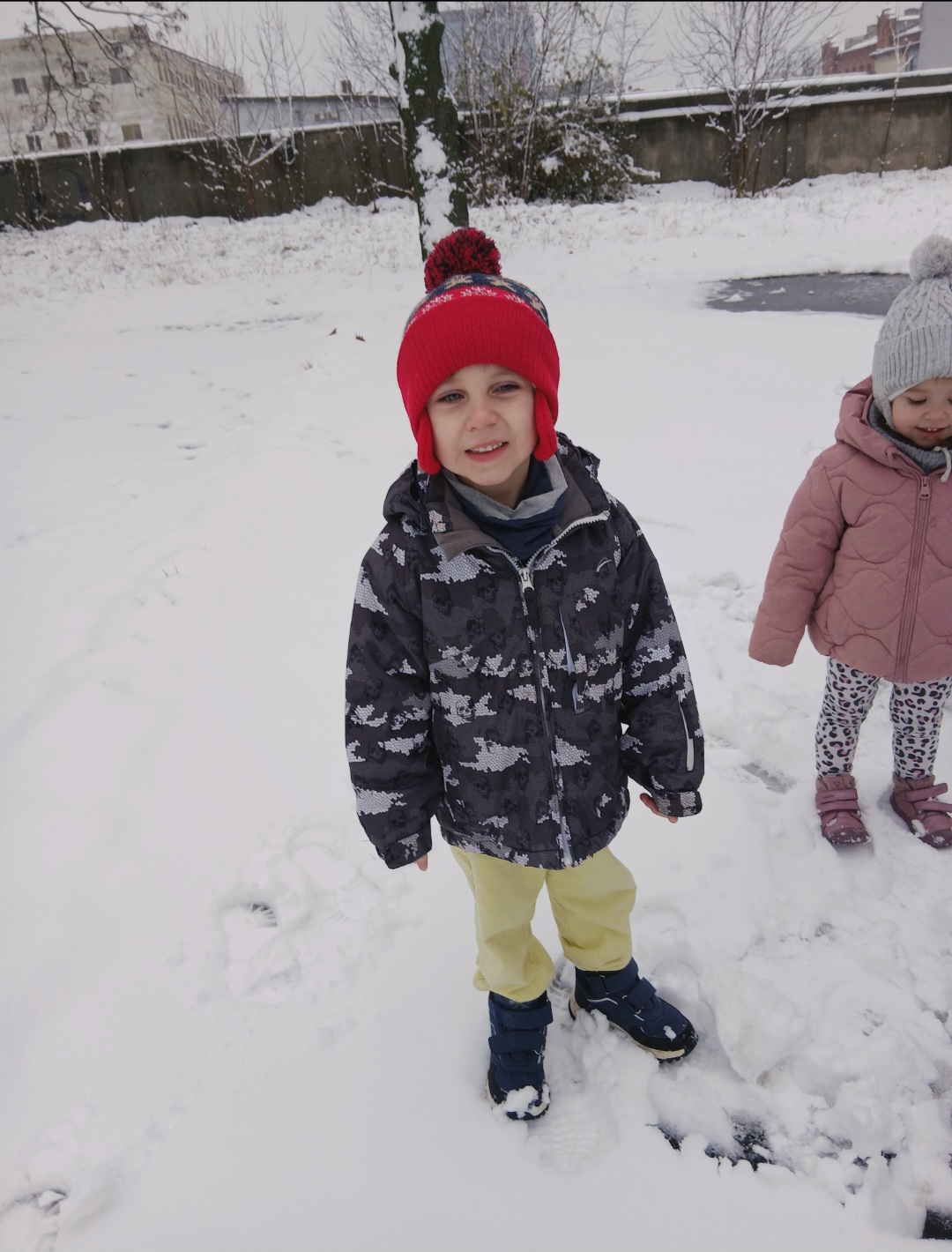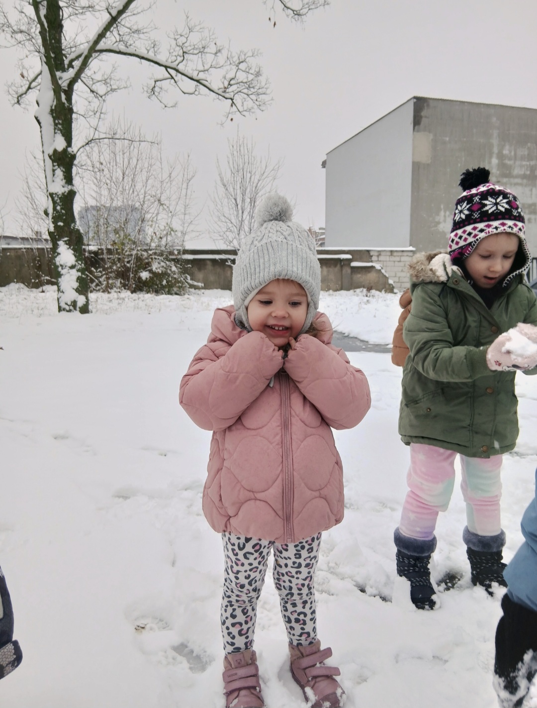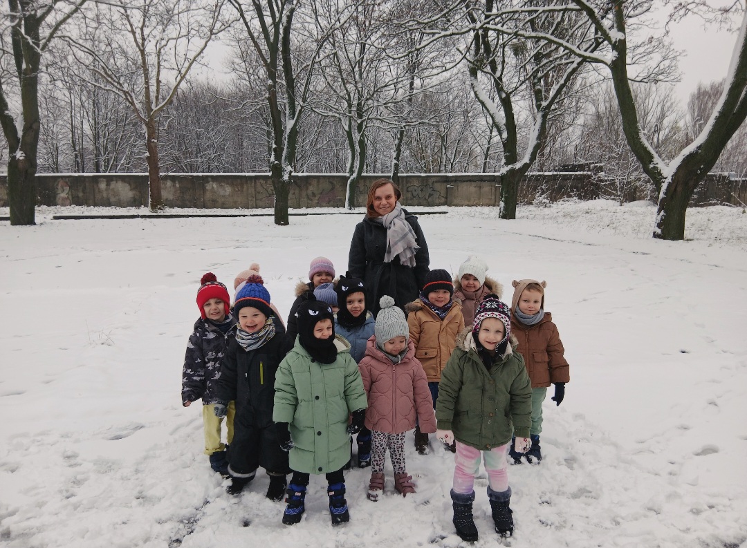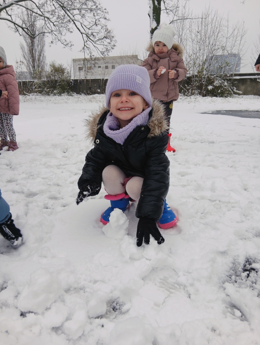 Biedroneczki z samego rana postanowiły, że dziś skorzystają z przepięknych, zimowych okoliczności przyrody. Tak też zrobiły i udały się na pobliskie boisko szkolne, gdzie uczestniczyły w zabawach ruchowych oraz ulepiły swojego pierwszego bałwana. Było super!
